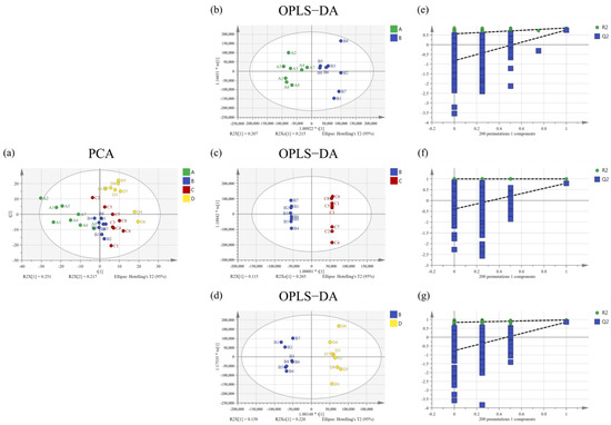 Principal component analysis score plot (PCA), (a), orthogonal partial least squared-discriminant analysis (OPLS-DA) score plot (b–d), and permutation plot (200 permutations), (e–g) of serum samples collected from the normal group (A), model group (B), positive group (C), and peppermint essential oil group (D), (n = 8).