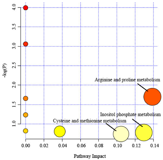 The differential metabolites screened from serum samples were respectively input into the MetaboAnalyst 5.0 platform to determine the important metabolic pathways related to learning and memory impairment. Results show that differential metabolites mainly affected (Pathway Impact > 1) the metabolic pathways of arginine and proline metabolism, inositol phosphate metabolism, and cysteine and methionine metabolism (Figure 4).