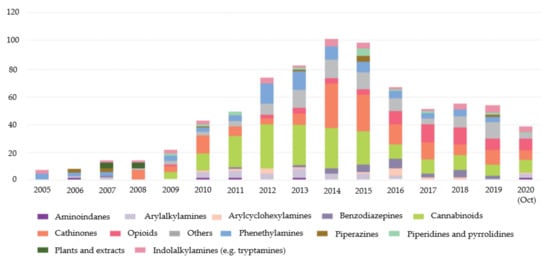 Between 1997 and 2020, the European Monitoring Centre for Drugs and Drug Addiction (EMCDDA) was monitoring more than 820 NPS. Despite this number, it is possible to observe that, since 2015, the number of NPS notified for the first time has been decreasing (Figure 1). In 2019, 53 NPS were reported for the first time and in 2020, until October, the number was 38 [5].
