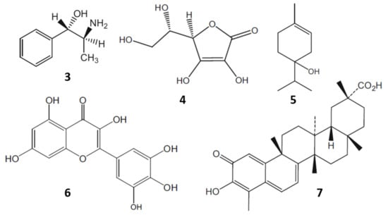 Some bioactive components of khat: cathine (3); ascorbic acid (4); α-terpineol (5); myricetin (6); and celastrol (7).