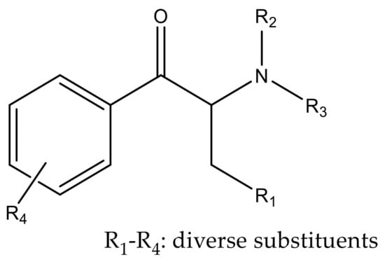 Synthetic cathinones are β-keto phenethylamine derivatives presenting the same core structure. Moreover, they are structurally similar to amphetamine, with the difference being the presence of a keto group [14,16]. Cathinone derivatives can be synthesized by the addition of several substituents at different sites of the cathinone scaffold as represented in Figure 4 [17].