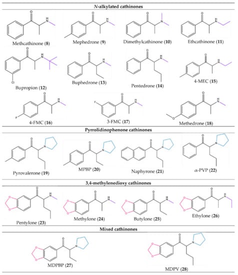 Examples of synthetic cathinones from each group based on the substitution pattern: (8)–(18) from the N-alkylated cathinones, (19)–(22) from the pyrrolidinophenone cathinones, (23)–(26) from the 3,4-methylenedioxy cathinones and (27) and (28) from the mixed cathinones.