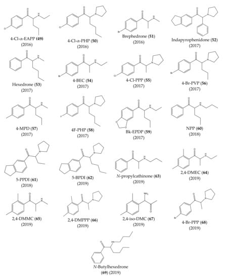 The chemical structures of the first cathinones are being constantly modified. Each year several new derivatives emerge on the illegal drug market. The chemical structures of synthetic cathinones (29–69) clandestinely synthetized and reported since 2014 are represented in Figure 7 and Figure 8.