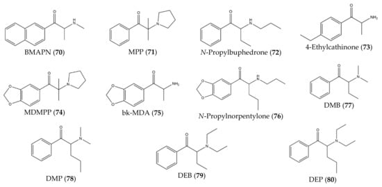 Besides that, some studies have described novel synthetic cathinones (70–80) that were synthesized in controlled laboratories (instead of found in the drug market) with the purpose of studying potential effects and to develop analytical techniques for the identification and characterization of future cathinones (Figure 9).