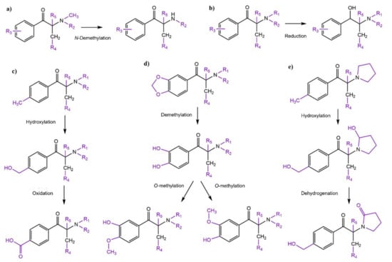 General metabolic pathways of synthetic cathinones: (a) main metabolic pathways of N-alkylated cathinones; (b) reduction of the β-keto moiety to an alcohol; (c) hydroxylation and further oxidation of the methyl substituent of the aromatic ring to a carboxylic acid; (d) metabolism of the 3,4-methylenedioxy ring; (e) metabolism of the pyrrolidinyl ring to a lactam.