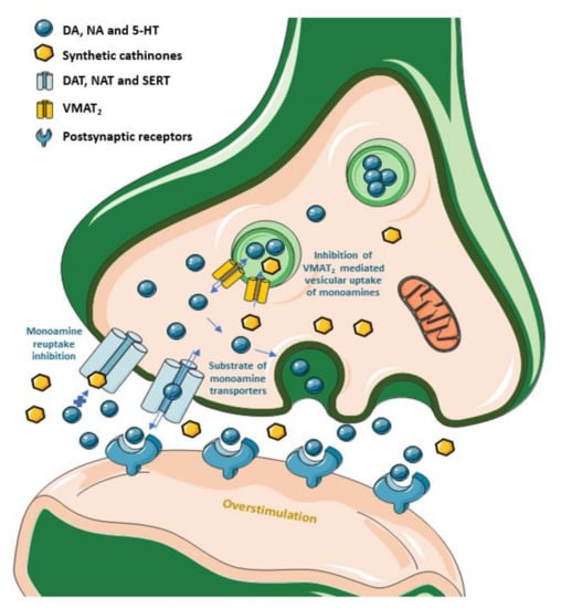In a similar way to other illicit drugs, synthetic cathinones seem to display their psychostimulant properties due to interactions with membrane transporters for monoamines, such as noradrenaline transporters (NAT), serotonin transporters (SERT), and dopamine transporters (DAT) [4,6,20]. These interactions can occur through inhibition of the mononamine reuptake from the synaptic cleft (by binding to the NAT, SERT and/or DAT) and/or promotion of the release of monoamines (for instance, by inhibition of the vesicular monoamine transporter-2 (VMAT2)). Both mechanisms lead to an increase in extracellular concentrations of monoamines amplifying cell-to-cell monoamine signaling (Figure 11) [51,52]. The affinity of this interaction can, however, differ greatly between derivatives. Therefore, besides the previous classification based on the substitution pattern, synthetic cathinones can also be divided according to the type of interaction with monoamine transporters [4,6,20].