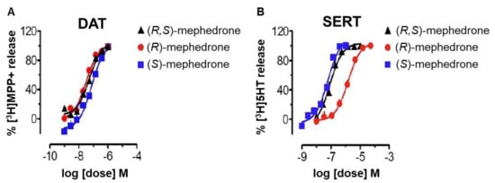 Effects of the enantiomers and racemate of mephedrone on monoamine release via DAT and SERT [58]. (A) DAT: dopamine transporters; MPP+: 1-methyl-4-phenylpyridinium (substrate for DAT); (B) SERT: serotonin transporters; 5HT: 5-hydroxytryptamine (serotonin).