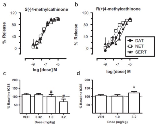 Effects of S-(−)4-methylcathinone and R-(+)-4methylcathinone on monoamine release via DAT, SERT and NET ((a) and (b), respectively) and on ICSS (c) and (d), respectively) [59]. DAT: dopamine transporters; NET: norepinephrine transporters; SERT: serotonin transporters; ICSS: intracranial self-stimulation. * indicate significant increases and # indicated significant decreases in ICSS rates relative to vehicle for at least one stimulation frequency as determined by analysis of frequency–rate curves in panels (a,b).