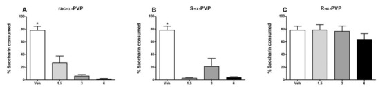 Avoidance tests with racemic α-PVP (A), S-α-PVP (B) and R-α-PVP (C). * Significantly different from 1.5, 3, and 5 [66].