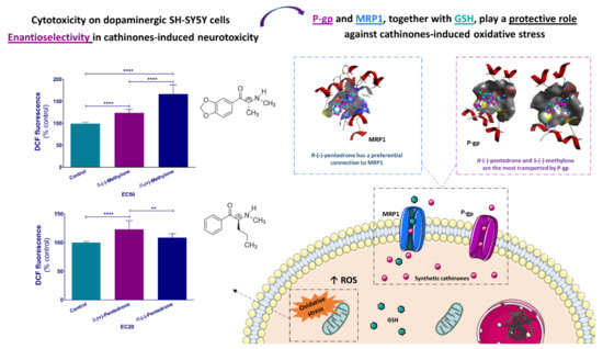 Enantioselectivity studies on neurocytotoxicity of methylone (24) and pentedrone (14) towards dopaminergic SH-SY5Y cells and the role of the efflux transporter multidrug-resistance-associated protein 1 (MRP1) and P-glycoprotein (P-gp). ** p < 0.01, **** p < 0.0001. (Reprint with permission from [71], Copyright (2021) Elsevier).
