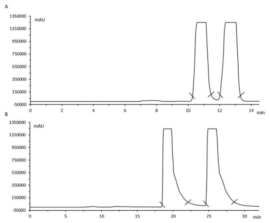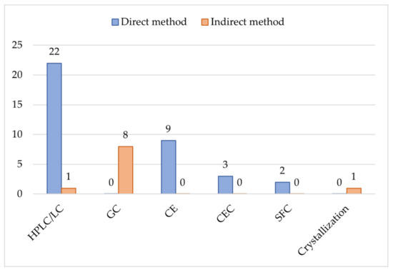Chromatographic enantioseparations by gas chromatography (GC) and liquid chromatography (LC) can be performed through either indirect or direct methods. For GC, an indirect approach is the most common since few chiral stationary phases (CSPs) are available. For LC, high-performance liquid chromatography (HPLC) using CSPs is the most-used method since there are several available CSPs. Moreover, this method can be coupled with different detection methods such as ultra-violet (UV)-visible (vis) absorption and mass spectrometry (MS), which is an advantage [82]. Thus, HPLC using CSPs is considered the most versatile and practical method, being used for both analytical and preparative purposes [83]. Nonetheless, ultra-high-performance liquid chromatography (UHPLC) has been gaining more attention, since it has higher selectivity, efficiency, and a shorter analysis time than HPLC and there are already available CSPs that can be adapted for this method [84,85].