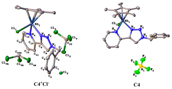 The N3-Rh1-N4 bond angles are constrained to 76.19 (C4+Cl) and 76.9 (C4). It appears that the complex with Cl counterion (C4+Cl) has greater ring strain than that with BF4 counterion (C4). The bulky counterion provides comparatively more stability to the metal centre by relieving the ring strain. The M-N3 or M-Cl bond length is within range with other Rh(III) triazolyl complexes reported in the literature to have demonstrated good catalytic conversion [20] and cytotoxic activity [18]. Another observation is that the M-N3 bonds are slightly shorter than the M-N4 bonds, evidencing increased backdonation into the triazolyl ring. In general, the complexes are not symmetrical around the metal centres, and therefore, they are chiral at the metal centre.