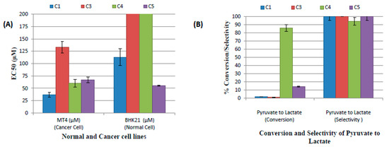 Figure 2. (A) Effective concentration (EC50) of compounds resulting in 50% cell viability decrease determined using the colorimetric MTS assay for complexes C1, C3C5 (A) as evaluated against normal kidney cells (BHK21) and Leukemia cells (MT4), and (B) comparative graphs showing the catalytic conversion and selectivity for the transformation of pyruvate to lactate by complexes C1, C3C5. Error bars represent standard deviation from the mean for n = 6 in the case of cytotoxic evaluation and mean ± SD for n = 3 catalytic runs.