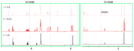 From these time-dependent experiments, two significant changes can be observed from the 1H NMR spectra. Firstly, there is a noticeable decrease in the intensity of the triazolyl H5 at 8.83 ppm, perhaps due to deprotonation, but which failed to disappear even after 80 h, probably because of equilibrium between the product species and the substrate in the reaction mixture. Secondly, there is a decrease in the intensity of the benzyl methylene proton of C1, suggesting proximity with the triazolyl H5 proton through space. These observations are in agreement with the carbenylation mechanism proposed by Rono et al. [18] for triazolyl complexes. Additionally, coordination through the imidazole N7 of 5′-GMP can be observed through the appearance of new peaks from both complex C1 and 5′-GMP (peaks with (*, $ and #) in Figure 3). For the 5′-GMP, the imidazole H-8 proton (proton “1”, Figure S83) shifted upfield from around 8.10 ppm to 7.87 ppm, attributable to the π-π stacking interactions between the nucleobase and the aromatic ligand [32,33,34]. For complex C1, there are significant downfield shifts in its peaks. The pyridinyl (H2p) proton close to the metal centre appear at 9.78 ppm, from 9.31 ppm of the free complex C1. In addition, the H2p proton and the p-cymene CH3 peaks appear as two distinct peaks in each case having approximately equal integral values, suggesting two different N-coordinated diastereomeric species in the mixture (Figure 3).