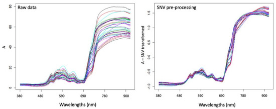 The standard normal variate (SNV) method performs normalization of the spectra, which consists of subtracting each spectrum by its own mean and dividing it by its own standard deviation. After SNV, each spectrum will have a mean of zero and a standard deviation of one (Figure 2). SNV attempts to make all the spectra comparable, in terms of intensities (or absorbance level), and it is important to reduce the scattering effects present in the original spectra [23,24].