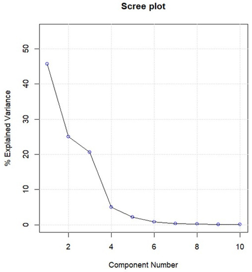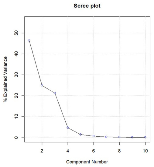 The PCA performed on the data set in question identifies three significant components that explain 45.6%, 25.0% and 20.6% of the variance (91.2% in total), respectively, as reported in the Scree plot (Figure 3).