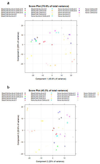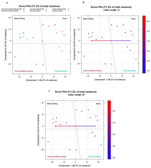 From the score plot of B18,521 in the plane PC1–PC2 (71.2% total variance explained of the whole data set), with the objects coded according to the time point (t0, t1, and t2) and colored according to the different additive in the formulation, it is noticeable that the samples are well characterized by a precise position on the score plot (Figure 6). As highlighted in Figure 6a, PC1 explains the information connected to the chilling treatment, with the treated samples at negative scores (left-hand side of the plot) and the untreated samples at positive scores (right-hand side of the plot). On the other hand, PC2 explains the additive effect, with the citric acid formulated samples well separated at negative scores and the others at positive scores. Then, the CIELab coordinates were considered. The correlation between the L* coordinate (lightness) and the scores on PC1 is clear, where brighter samples are characterized by negative scores (left-hand side of the plot, blast chilled samples) (Figure 6b). The scores on PC1 are also correlated with the b* coordinate (bluish–yellowish), where the yellowish samples are characterized by negative scores (left-hand side of the plot, Figure 6c), leading to the conclusion that L* and b* are very much correlated. PC2, however, is not connected to any of the CIELab coordinates.