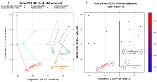 The score plot of data matrix B18,521 in the plane PC2–PC3. (a) The objects were coded according to the time point (t0, t1, and t2), colored and line-connected according to the additive used in the formulation (ascorbic acid, citric acid or the mixture of ascorbic acid and citric acid); (b) the correlation between the a* coordinate (greenish–reddish) and PC3 scores was highlighted.