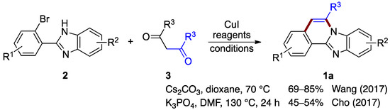 Copper(I)-catalyzed coupling protocols with o-bromophenyl benzimidazoles 2 and 1,3-diketones 3 [5,6].