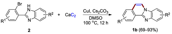 Copper(I)-catalyzed coupling protocol using o-bromophenyl benzimidazoles 2 and calcium carbide as reactants.