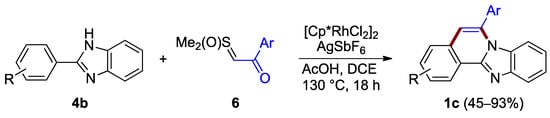 Ring B can also be formed in the absence of a halogen anchor. Cheng et al. reported the synthesis of benzimidazo[2,1-a]isoquinolines 1c through the annulation of non-halogenated 2-arylimidazoles 4b and the acetophenone-derived sulfoxonium ylide 6, under aerobic conditions (45–93% yield; Figure 5) [9]. The procedure relies on a rhodium species generated in situ, facilitating a C–C coupling and forming a C–N bond. The dichloro(pentamethylcyclopentadienyl)rhodium(III) precatalyst plays an important role in the reaction process where it is activated by acetic acid combined with a catalytic amount of silver hexafluoroantimonate.