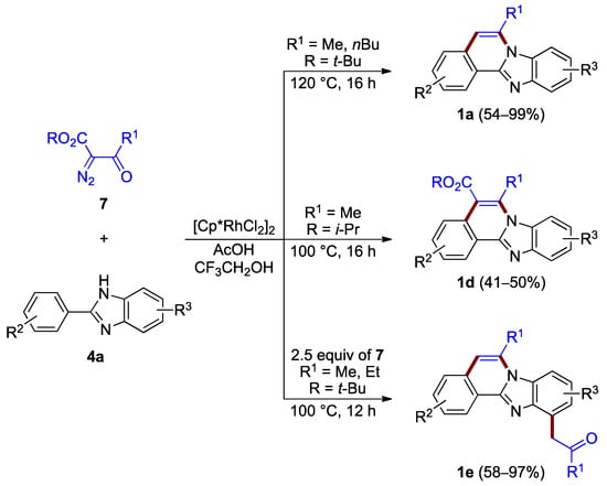 The presence of excess of diazo compounds 7, allows for double C–H activation and the addition of a methylene ketone unit, and leads to more functionalized derivatives 1e (58–97%; Figure 6 bottom) [11].