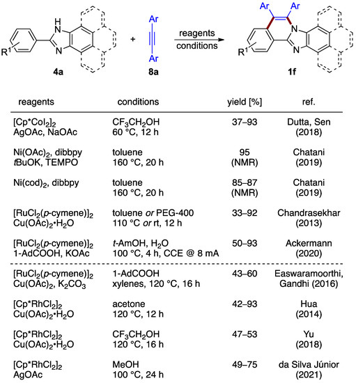 The oxidative annulation procedures rely on the formation of a vinylene unit between C–H and N–H moieties. The non-halogenated 2-arylbenzimidazoles 4a and a variety of diarylacetylenes 8a react in the presence of a catalytic amount of cobalt(III) catalyst and silver acetate as an oxidant, as reported by Dutta and Sen, yielding structures 1f (37–93%; Figure 7) [12]. Nickel complexes also have been shown by Chatani et al. to be active for an analogous reaction with diphenyl acetylene 8a (Ar = Ph) [13]. Various protocols featuring the presence or absence of base were elaborated (Figure 7). A similar synthesis catalyzed by [RuCl2(p-cymene)]2 was also reported (Chandrasekhar et al.; 43–60% yield) [14]. Another ruthenium-catalyzed process, elaborated by Ackermann et al., integrated an innovative electrochemical oxidation approach [15]. Molecular hydrogen is the sole byproduct, with the reaction proceeding with 50–93% yields (Figure 7). The key catalytic intermediate, aza-ruthena(II)-bicyclo-[3.2.0]-heptadiene, was isolated and characterized, increasing the mechanistic understanding of the process.