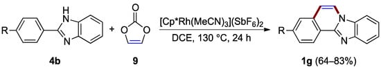 Without a demand for C–5 and C–6 substituents, vinylene carbonate 9 offers an effective source of the C–4a to N–7 bridging unit in the rhodium(III)-catalyzed annulation of 2-arylbenzimidazoles 4b, as reported by Nishii, Miura et al. (Figure 8) [20]. This protocol eliminated the need for an additive since vinylene carbonate acts as an internal oxidant to regenerate the rhodium(III) species while producing benzimidazo[2,1-a]isoquinolines 1g (64–83% yield).