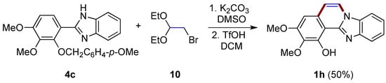 A two-step synthesis first involving the N-alkylation of 2-arylbenzimidazole 4c with bromoacetaldehyde diethyl acetal 10 and then the triflic acid-catalyzed intramolecular cyclization/deprotection of the phenolic hydroxy group allows the formation of benzimidazo[2,1-a]isoquinoline 1h in a moderate yield (50%; Figure 9), as described by Takagi et al. [21]. As clarified by the authors, this same reaction cannot be achieved using concentrated HCl.