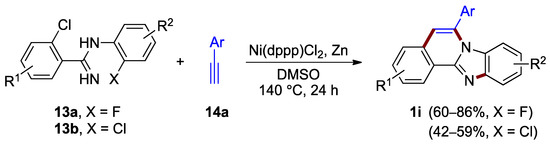 A method that facilitates the construction of both the imidazole ring C and the pyridine ring B utilizes two halogen anchors. Nickel complexes offer an effective tool for activating the reaction of these halogens and terminal alkynes. Xiao, Deng et al. reported the formation of benzimidazo[2,1-a]isoquinoline 1i as a major product in the nickel-catalyzed annulation of 2-chloro-N-(2-halophenyl)benzimidamides 13 with terminal alkynes such as 14a, under anhydrous conditions and elevated temperature (140 °C; Figure 12) [26]. The yield of the product is dependent on halogen in the starting material. The inspection of the yields for benzimidazo[2,1-a]isoquinolines 1i revealed the increased reactivity of the fluoroaryl reactant 13a (X = F; 60–86% yield) as compared to the chloroaryl reactant 13b (X = Cl; 42–59% yield).