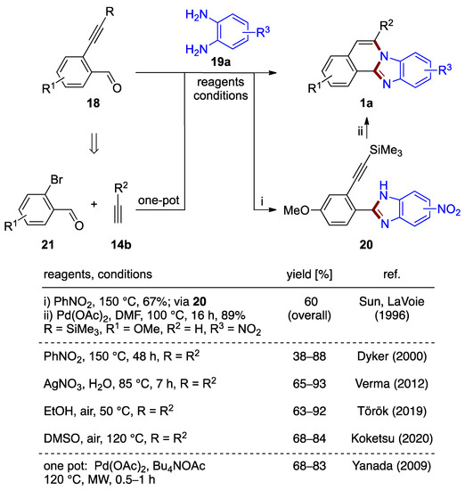 Dyker et al. investigated the tandem cyclization of substituted 2-ethynylbenzaldehydes 18 with o-phenylenediamines 19a (Figure 15, top pathway) [30]. The preparation of several benzimidazo[2,1-a]isoquinolines 1a in 38–88% yields was reported using nitrobenzene as the solvent and oxidizing agent at elevated temperature (150 °C, 2 d). This significant development offers a metal-catalyst-free preparation for this class of compounds [31].