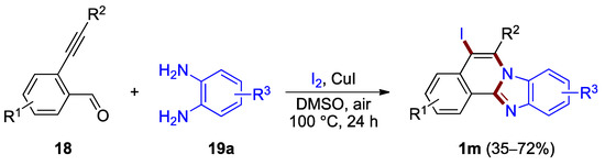 Zhong, Li et al. developed a one-pot method for the synthesis of iodine-functionalized benzimidazo[2,1-a]isoquinolines (Figure 16) [36]. A protocol involving a copper(I) iodide catalyst in the presence of iodine produces 5-iodo-substituted benzimidazo[2,1-a]isoquinolines 1m from 2-ethynylbenzaldehydes 18 and o-phenylenediamines 19a in moderate to good yield (35–72%). The analogous bromination reaction using N-bromosuccinimide as a halogen source has been reported in one example (45% yield) [36].