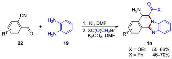 Other functionalization of the benzimidazo[2,1-a]isoquinoline core can also be achieved by a three-component, one-pot protocol developed for the synthesis of 5-amino- and 6-carbonyl-functionalized benzimidazo[2,1-a]isoquinolines 1n [37]. This transformation, elaborated by Kurth et al., proceeds via a transition-metal free protocol using commercially available o-cyanobenzaldehydes 22, o-phenylenediamines 19, and α-bromoacetate or α-bromoacetophenone (46–70% yields; Figure 17).