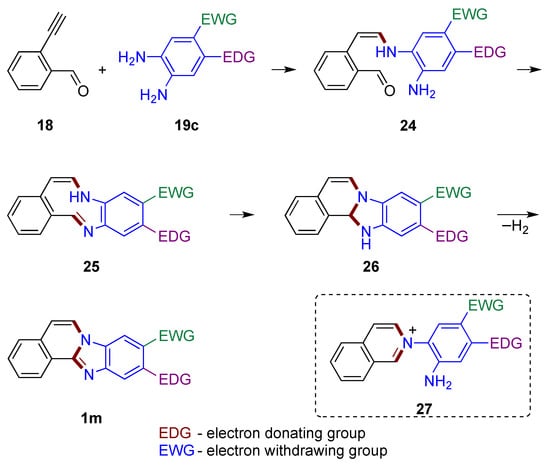 If alkyne 18 were to first react with o-phenylenediamine 19c, enamine 24 would form adjacent to the aldehyde group (Figure 19). The presence of electron donating group (EDG) and electron withdrawing group (EWG) in non-symmetrical o-phenylenediamines affects the nucleophilicity of the amino groups, and in turn determines the regioselectivity of the products. The unreacted amine function of the o-phenylenediamine is then available to attack the carbonyl group, forming an imine 25 embedded within the conjugated 9-membered ring system. Nucleophilic attack of the amine on the imine group yields tetracyclic structure 26, which is further oxidized to the final product 1m by atmospheric oxygen. The route (not illustrated) leading to the formation of a six-membered ring from attack of the carbonyl group by enamine 24 to give potentially reactive isoquinolinium intermediate 27 should be considered as less likely [33].