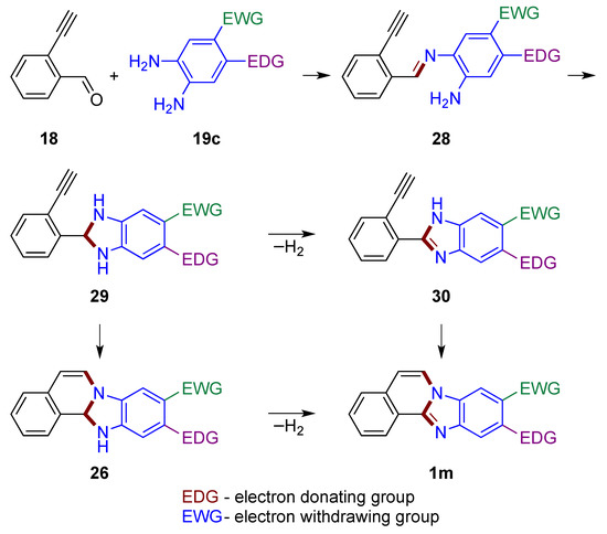 A plausible pathway in which the carbonyl group reacts first is shown in Figure 20. In the first step, the reaction of aldehyde 18 with o-phenylenediamine 19c yields imine 28. The imine’s carbonyl carbon then connects to the second amino group of the phenylenediamine to form a dihydrobenzimidazole 29. Oxidation to the benzimidazole 30 (similar to structure 20, Figure 15) may take place [1,33], which is followed by the attack of the triple bond by the enamine nitrogen atom leading to the final product 1m. If attack of the triple bond by nitrogen takes place first, leading to the dihydro derivative 26, subsequent oxidation by atmospheric oxygen yields the final product 1m. It should be noted that regioselective induction may occur by attack on the alkyne by the more nucleophilic nitrogen in both structures 29 and 30 (possible rotation around a single bond). The EDG and EWG locations illustrated in 19c impact o-phenylenediamine nucleophilic nitrogen atoms in a synergistic manner for both discussed mechanisms (Figure 19 and Figure 20).