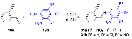 The isolation of several intermediates supports the mechanism provided in Figure 20. The reaction of unsubstituted 2-ethnylbenzaldehyde 18a with selected o-phenylenediamines 19d results in an imine intermediate before a reaction involving the alkyne moiety (Figure 21) [34]. The detection of intermediate 31a,b suggests the reaction at the carbonyl group occurs before the alkyne. Given the electron-withdrawing character of the nitro substituent, the isolation of imines 31a,b also supports the hypothesis that the more electron-rich amino group of the o-phenylenediamine reacts soonest [34].