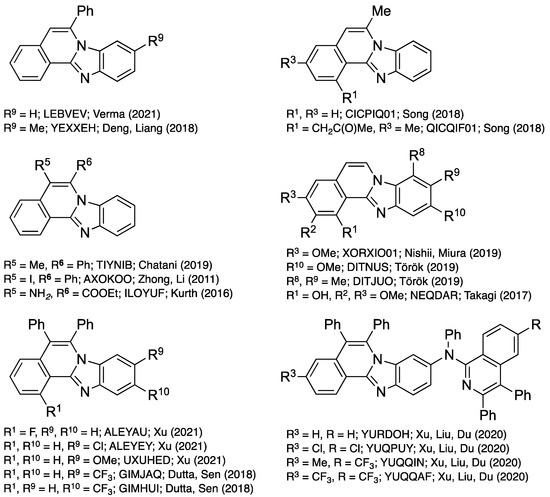 Structures and CSD reference codes of crystallographically characterized derivatives of benzimidazo[2,1-a]isoquinolines 1 [10,11,12,13,20,21,27,28,29,33,34,36,37].
