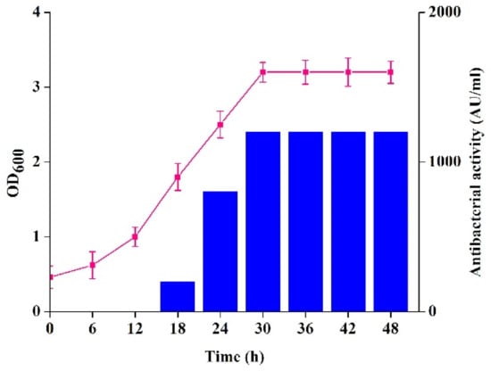 Bacteriocin production began after 8 h, and the stable high level was recorded after 30 h of growth in MRS broth (Figure 1). Similar results were also reported for other LAB bacteriocin-producing strains, such as Companilactobacillus crustorum MN047 [17], Lactobacillus plantarum ST16Pa [18], and Pediococcus acidilactici HW01 [19]. Bacteriocin might be the secondary metabolites of lactic acid bacteria.