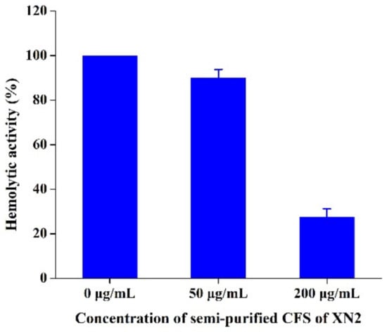 Compared with the control, the hemolytic activity of S. aureus CICC 10384 decreased to 90.05% and 27.34%, following treatment with 1/2 MIC and 2 MIC semi-purified CFS of strain XN2, respectively (Figure 4).