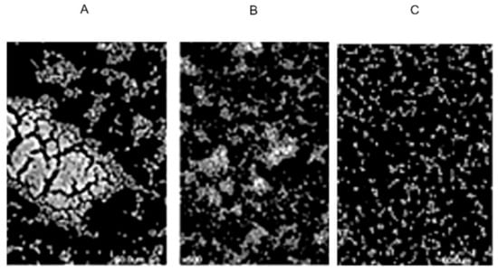 Effect of semi-purified CFS of strain XN2 on the biofilm formation of S. aureus; (A): control (S. aureus cells treated with no semi-purified CFS); (B): with 1/2 MIC semi-purified CFS; and (C): with 2 MIC semi-purified CFS.