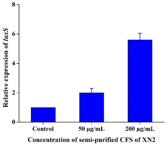 Effect of semi-purified CFS of strain XN2 on the relative expression of luxS of S. aureus. The data are shown as mean ± standard deviation. The critical limit is 5%. p < 0.05, the differences are significant.
