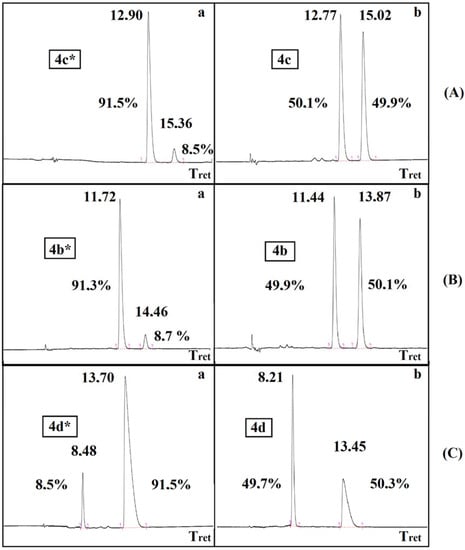 Chiral HPLC chromatograms Aa, Ba, Ca and Ab, Bb, Cb for the optically active 4c*, 4b*, 4d* α-hydroxyphosphonates and for the racemic 4c, 4b, 4d derivatives, respectively.
