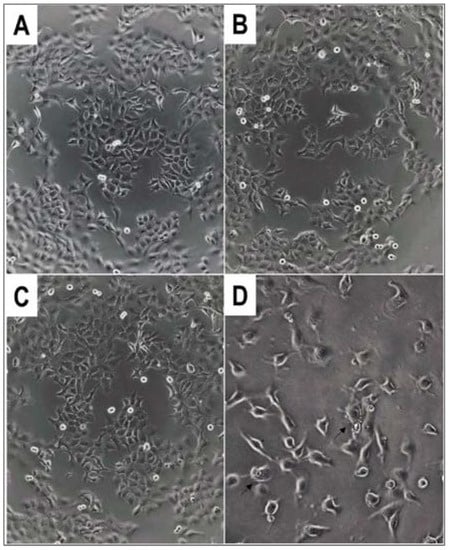 Morphology of A431 human skin carcinoma cells after overnight treatment with α-hydroxyphoshpnate derivatives 4c* and 4d at c = 50 µM. (A) Untreated control (100× magnification); (B) 4c* (100×); (C) 4d (100×); (D) 4d (200×). Arrows show membrane blebbing.