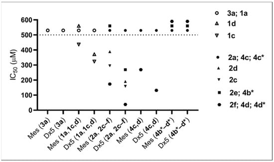 IC50 values of the tested compounds against Mes-Sa mCh (Mes) and Mes-Sa/Dx5 eGFP (Dx5). Compounds that did not trigger at least 50% growth inhibition at 500 µM were considered nontoxic; these are shown above the dashed line at 500 µM.
