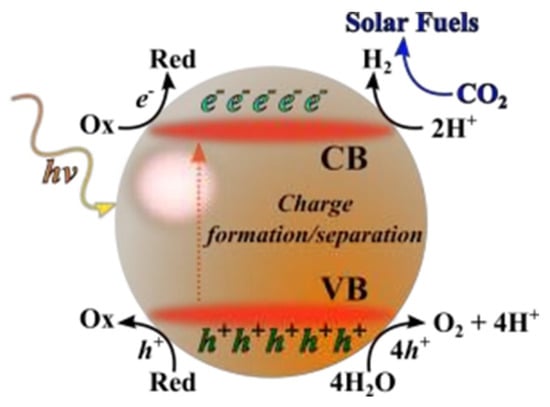 When light falls on material then it adsorbs according to the band gap energy of SC material and the photocatalytic activity started. This absorbed energy is used in the reductive process for the designed purpose, such as reduction of CO2 or removal of organic dyes from water. After the absorbance of light energy on the surface of the semiconductor, the electrons move from the valance band to the conduction and due to this, +ve charged particles (h+s) are produced in the valance band of the semiconductor material. This movement of charge carriers can only be possible if the band gap energy is less than the energy of the incoming light falling on the photocatalyst. The catalyst material performance and efficiency are not restricted to the band gap of material with appropriate irradiated light and inhibition (e− and h+) recombination with different material modification methods. It also depends on many factors such as size of particle, SA, deposition process, and NHE potential of the final product. In future, to obtain better results, effectiveness of these factors and restriction of electron and hole recombination can play a significant role in photocatalytic activity [51]. The diagram of the typical photoreaction process for the production of different renewable fuels is given below in Figure 5.