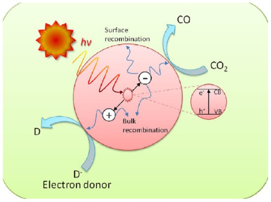Usually, SC materials have been used as photocatalysts; when light with suitable energy falls on the catalyst, the electrons move from the valance band (VB) to the conduction band (CB). There is an energy difference between the valance band and the CB of the photocatalyst which is called the band gap [46]. The charge carriers (e− and h+) are generated when the light strikes on the surface of photocatalysts with suitable energy greater than the band gap energy of SCs. These electrons and holes play a vital role in the oxidation and reduction reactions to obtain the product [24,47]. In this process, if photogenerated charge carriers (e− and h+) are not rapidly exhausted, then there is the possibility to recombine and lose their energy. During this process, e− and h+ could undergo modification on the surface of photocatalyst material and become recombined. There are two possibilities for this recombination; one is small EBG of catalyst material where electrons and holes may be easily recombined and the other is where these photogenerated particles cannot find the material to react and are recombined due to a very small lifetime [48]. Some basic steps such as: (i) absorbance of light; (ii) production of e− and h+ pairs; (iii) transportation of these photogenerated charges to the surface of the material; (iv) adsorption on the catalyst surface; (v) oxidation and reduction reactions; and (vi) formation of desired product occur during this reaction [49]. The schematic diagram of the charge recombination process across the photocatalyst material is given in Figure 4.