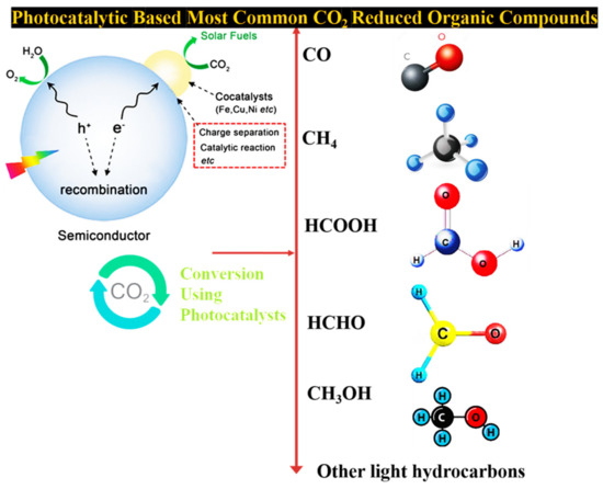 The possible photocatalytic CO2 conversion mechanism commonly includes three main phases: (I) photogenerated electron–hole pairs; (II) separation and transformation on the surface of catalysts; and (III) redox reaction among photogenerated charge carriers and surface adsorbed species. The CO2 reduction was achieved in both solution and gas phase. The most common reduced organic compounds are shown in Figure 7.
