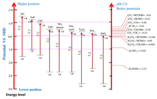 In the photoreduction of CO2, two types of reactions are involved: one is CO2 reduction and the other is oxidation of H2O. Usually, we consider the thermodynamics of CO2 reduction; then we also explain it in respect to CB and VB of the photocatalyst. The possibility of thermodynamics for the production of renewable and green fuels can be determined with the help of the position of CB in the photocatalyst material. The position of CB, the VB of various photocatalysts, their band gap energy and reduction potential related with promising green and renewable fuels are described in Figure 10. We take an example of TiO2 with a valence band and conduction band potential of 2.7 eV and −0.50 eV, respectively, as the photocatalyst for CO2 reduction. If we discuss this thermodynamically, then some environmentally friendly fuel may be formed which has less (-ve) reduction potential than the conduction band of TiO2 from carbon dioxide photoreduction such as CH4 (−0.24 eV) and CH3OH (−0.38 eV). Similarly, TiO2 photocatalyst can oxidize those materials which have less redox potential than its valence band potential [67]. Through results, it is proven that CB, VB, and energy obtained from the light play a significant role in thermodynamics of photocatalytic CO2 reduction.