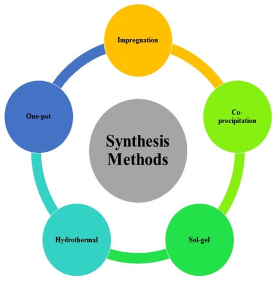 In this section, we discuss various synthesis methods such as hydrothermal, sol-gel, impregnation, one-pot, co-precipitation, and other methods. Figure 12 illustrates some possible synthesis techniques.