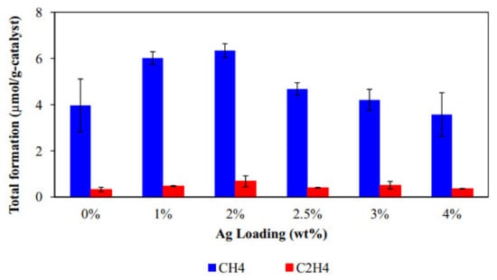 Production of CH4 and C2H4 over Ag-MWCNT@TiO2 for various concentrations of Ag. Reprinted with permission from Elsevier, 19 December 2021 Ref. [80].